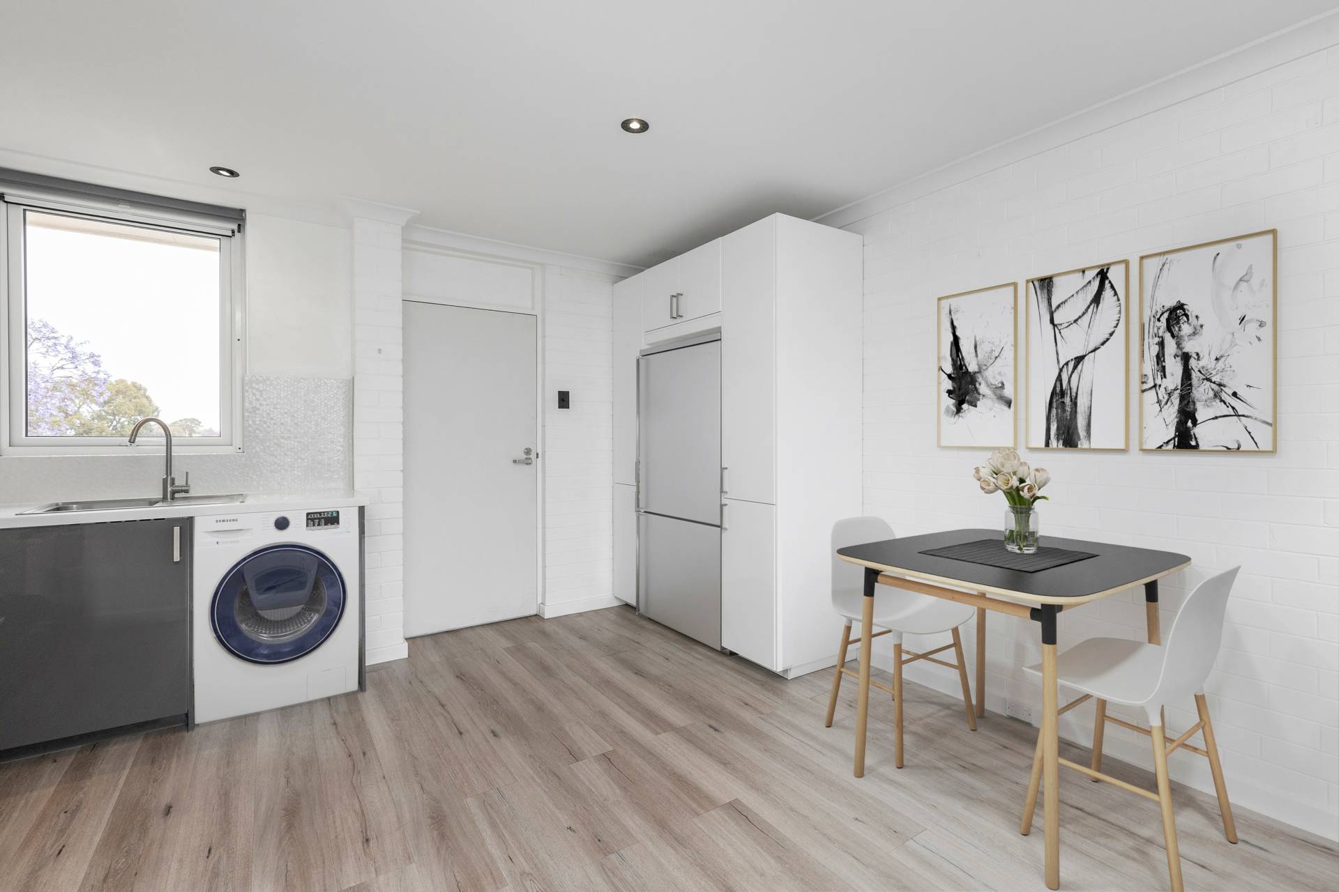 New windows and doors have been installed to ensure a modern feel to go with your modern kitchen and bathroom.  Vinyl plank floors throughout, except in the bathroom, which has beautiful mid-century tiles in the bathroom and separate toilet.