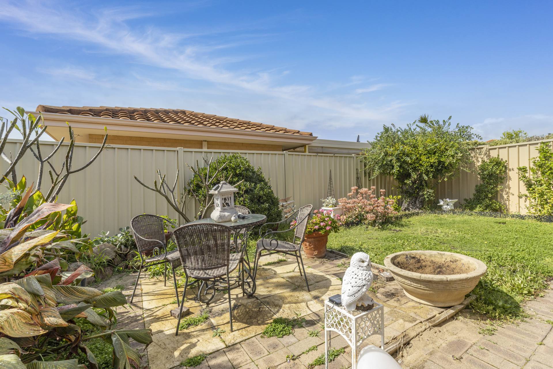 The villa boasts an excellent wrap-around courtyard that provides ample space for outdoor relaxation and entertaining. Step onto the covered patio, perfect for enjoying your morning coffee or hosting evening gatherings with friends and family.  A sliding door from the living area seamlessly connects your indoor and outdoor spaces, allowing you to relish the beautiful surroundings and fresh air.