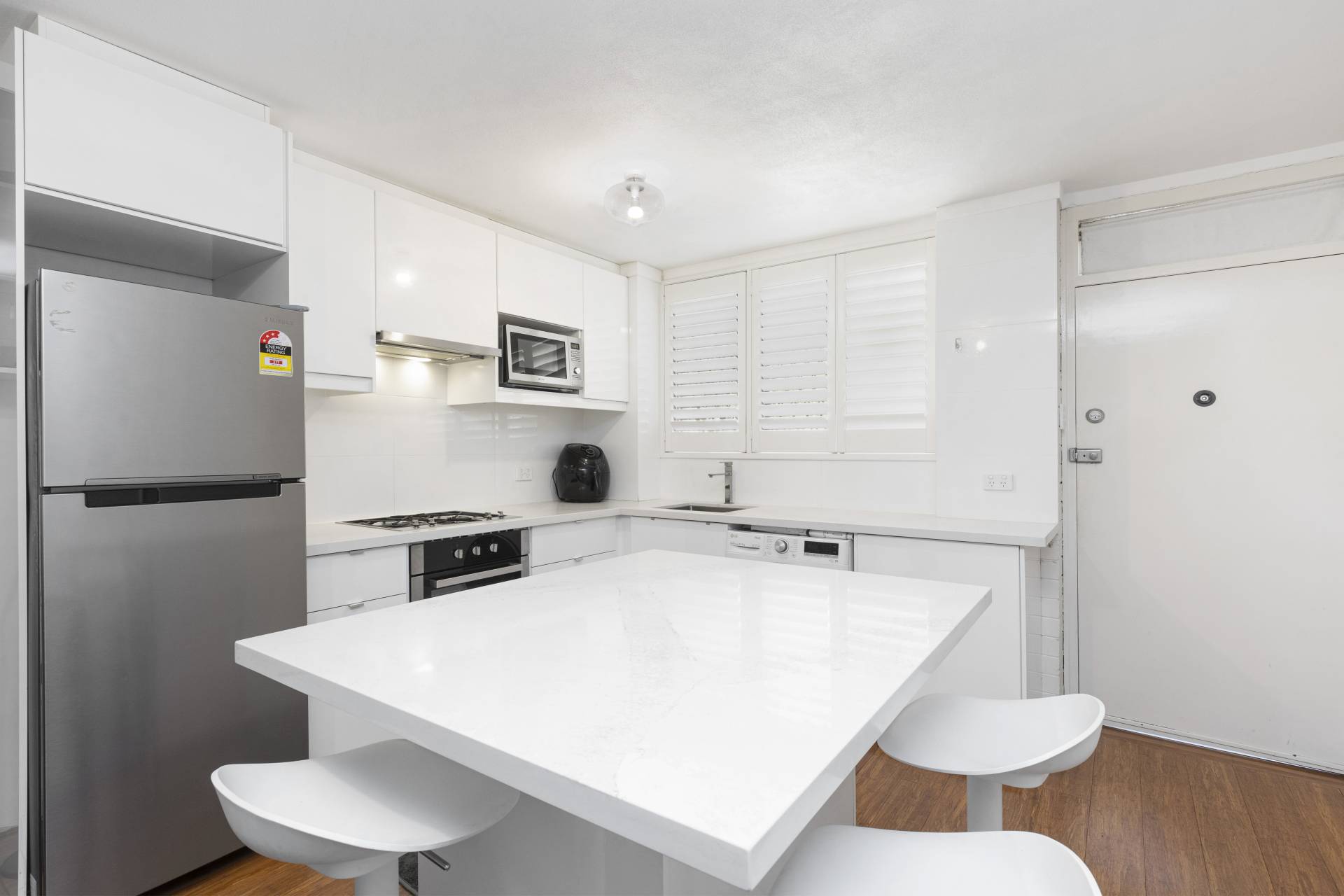 • Boardwalk timber shutters in kitchen and bedroom.