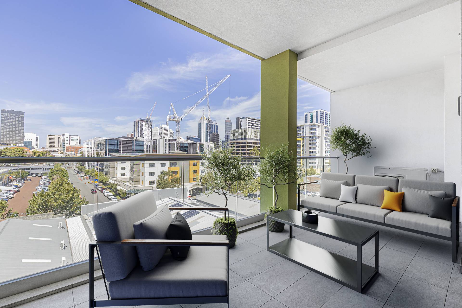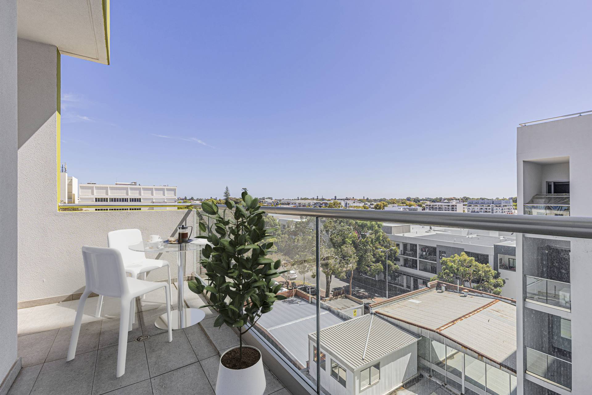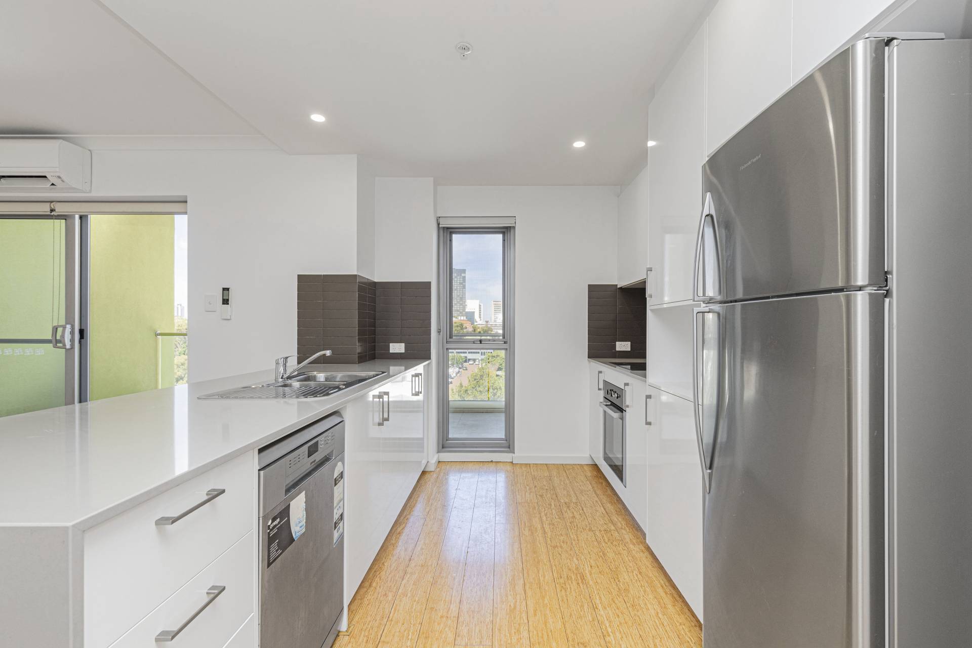 The master bedroom features its own private balcony, ideal for enjoying your morning coffee while taking in the views. A second balcony offers even more opportunities to relax and appreciate the cityscape. The apartment is fitted with bamboo flooring throughout and includes a dishwasher and reverse cycle air conditioning for year-round comfort.
