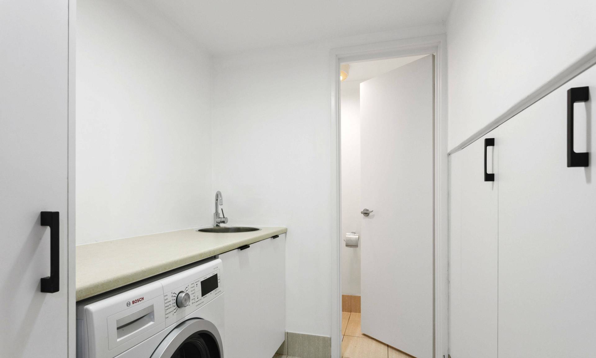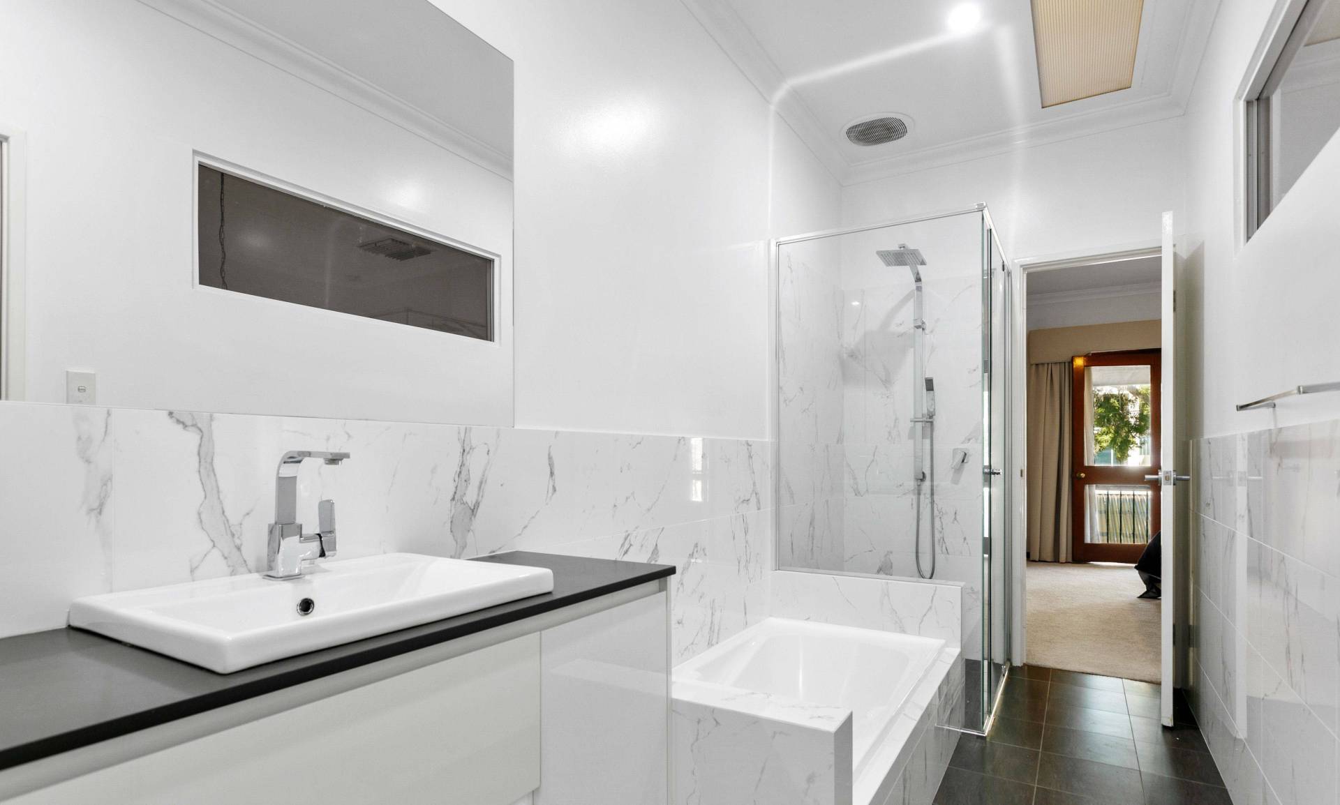 The semi-ensuite bathroom is both stylish and spacious, with a separate bath, large shower, and ample storage. A separate laundry adds further convenience, with plenty of storage space and a second toilet. Gated undercover parking for one car completes the package.