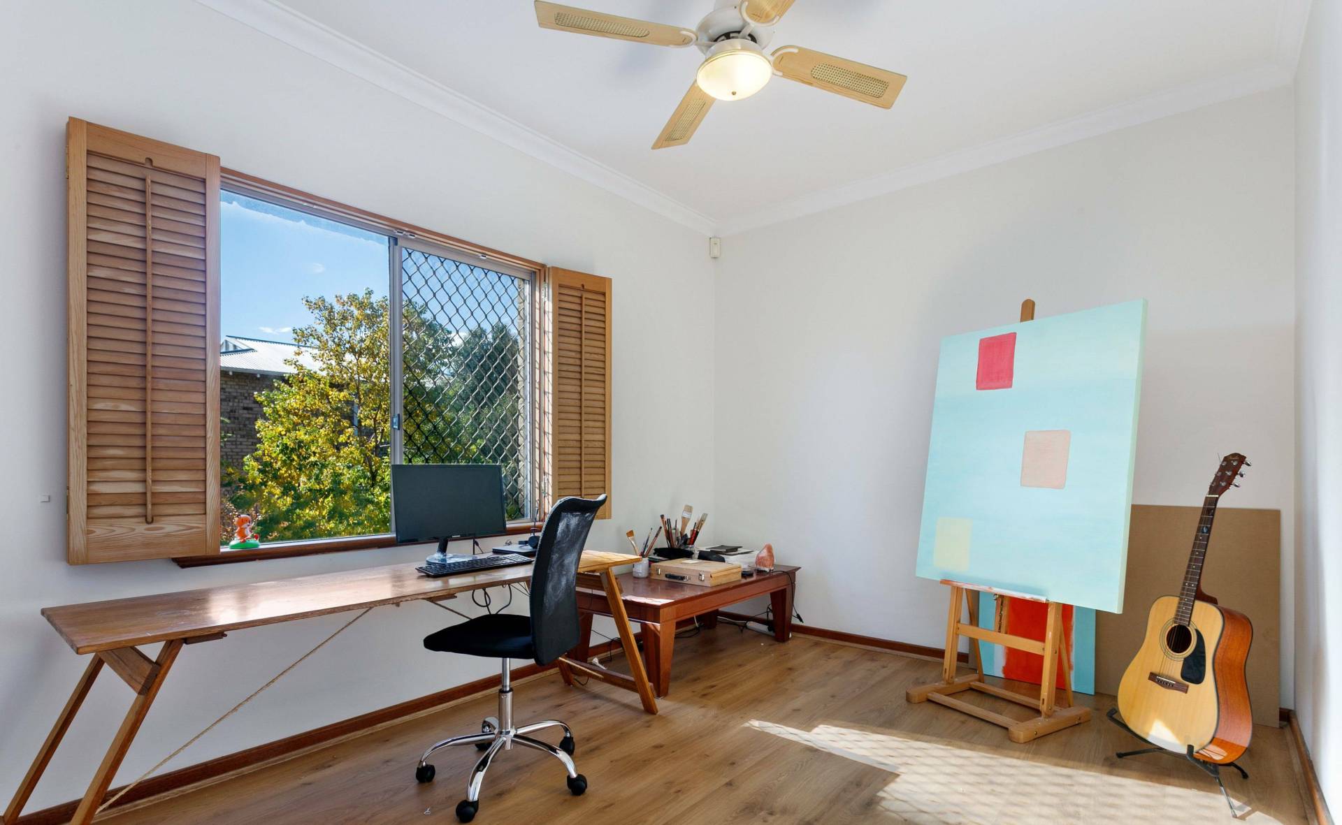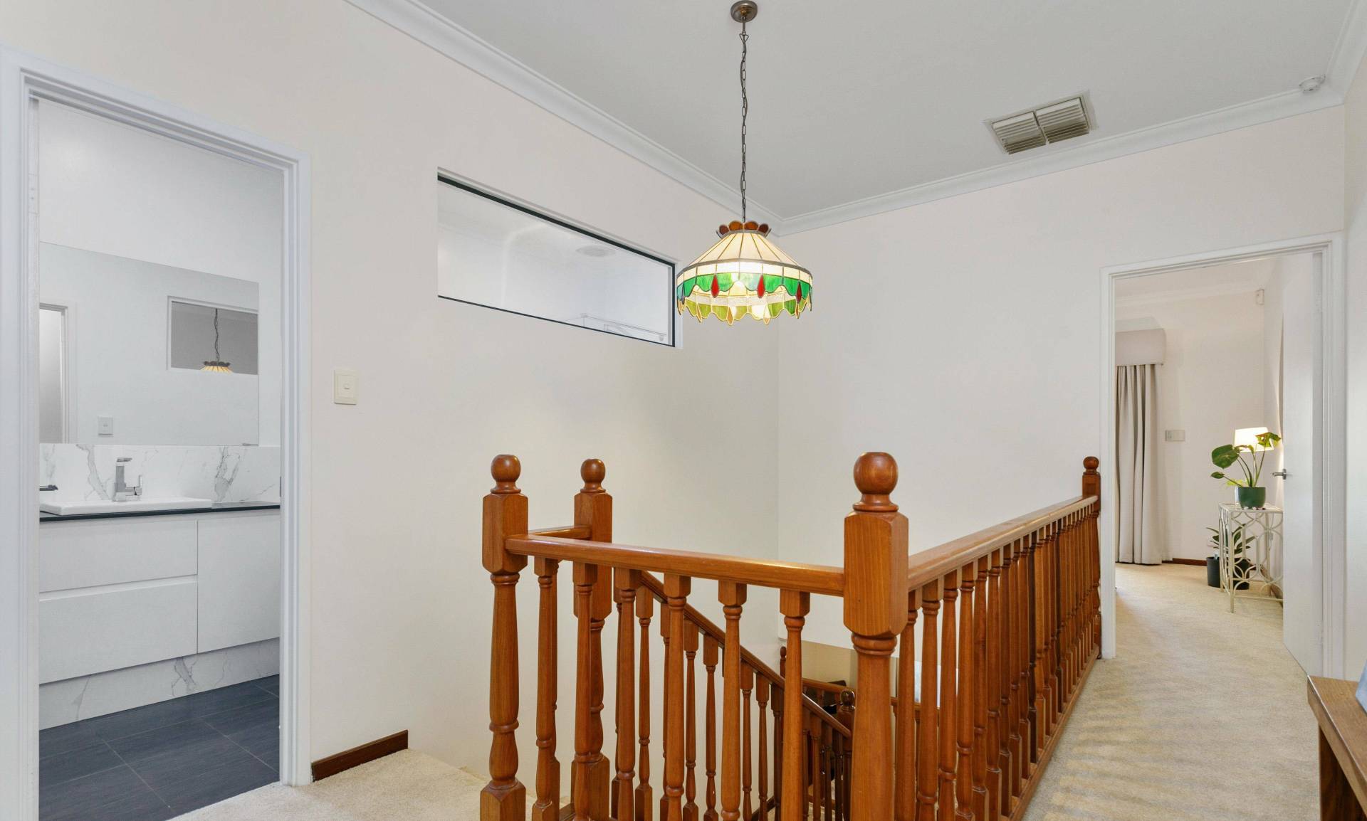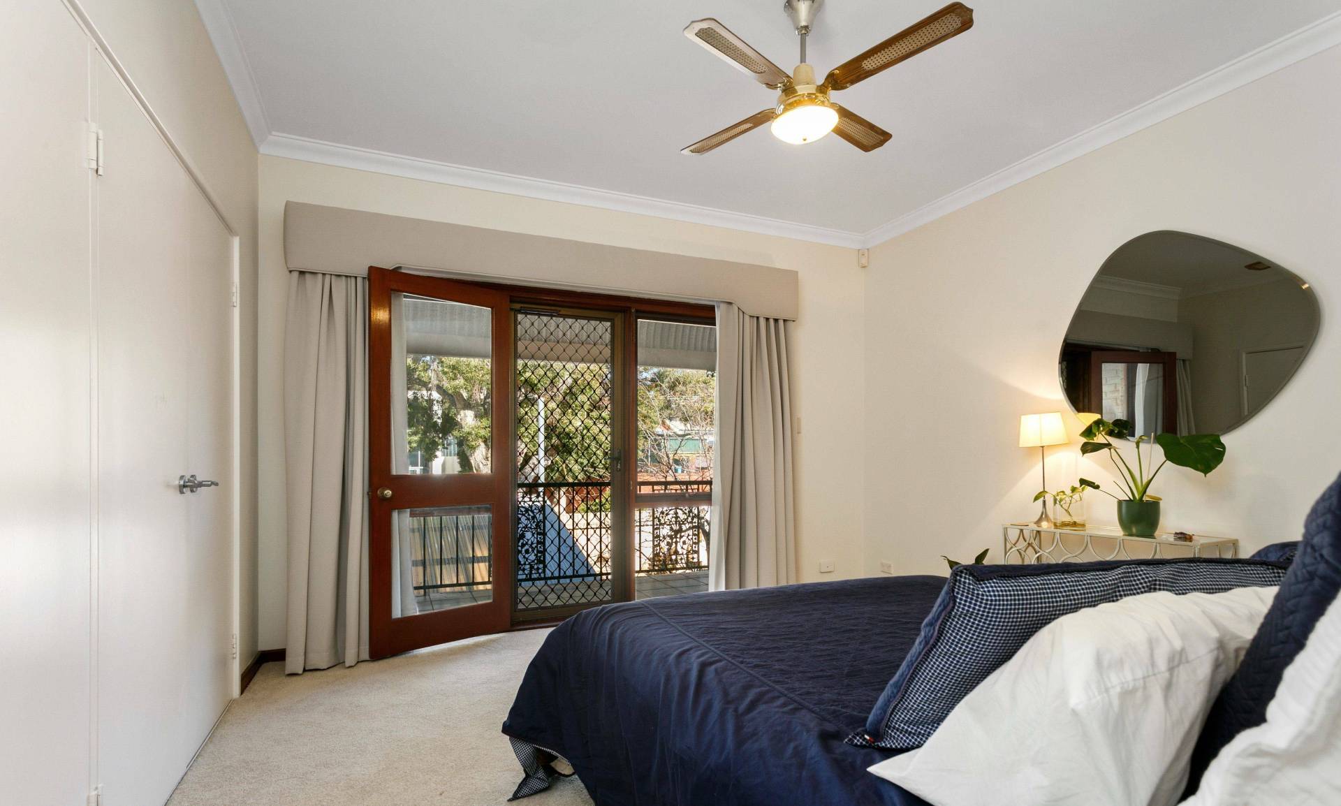 Upstairs, you’ll find two generous bedrooms, both with ceiling fans. The master bedroom is a standout, offering reverse cycle air conditioning, dual built-in robes, and direct access to a charming bullnose veranda balcony overlooking the treetops.