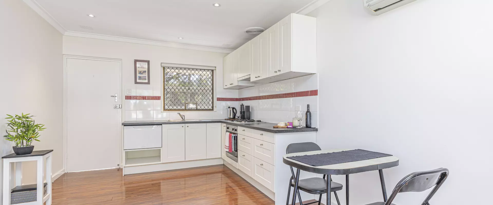 The home features a large balcony perfect for relaxing or entertaining, a modern kitchen and bathroom, and air conditioning for year-round comfort.