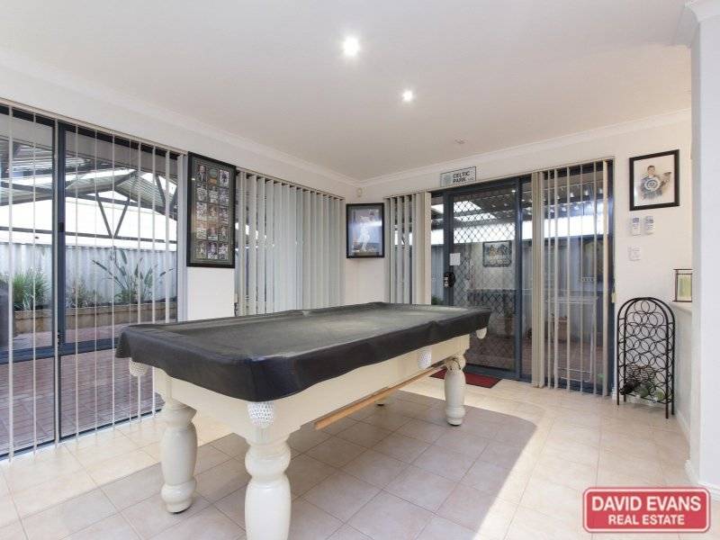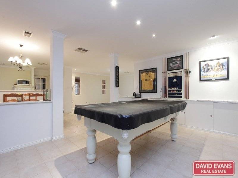 The main living area of this home has floor tiles throughout and comprises an open plan design; living, meals, kitchen and 5m x 3.6m games room. The kitchen has a Simpson electric fan-forced wall oven with microwave recess above, gas hotplates, double sink and double fridge/freezer recess. The games room has built-in low lying full length enclosed storage cupboards. Access to the garden entertaining area through a glass sliding door is located in the games room.
