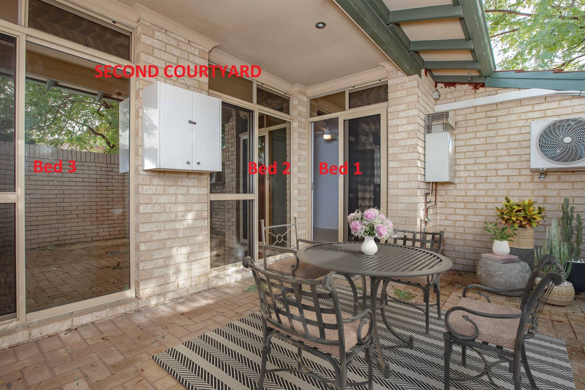 This well designed, three bedroom home villa with each bedroom opening onto sun dappled courtyard and large living room opening onto main courtyard with under cover pergola.