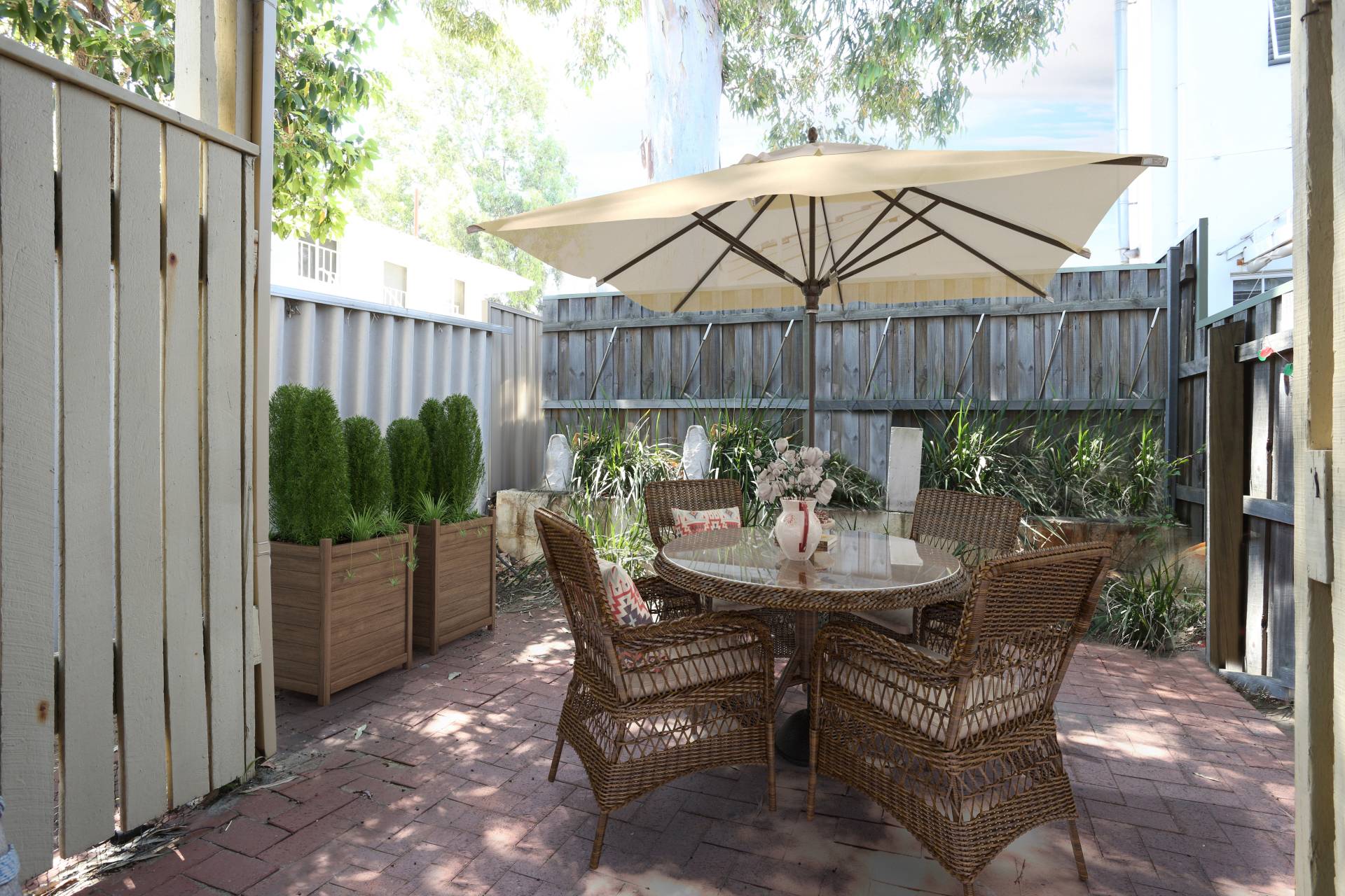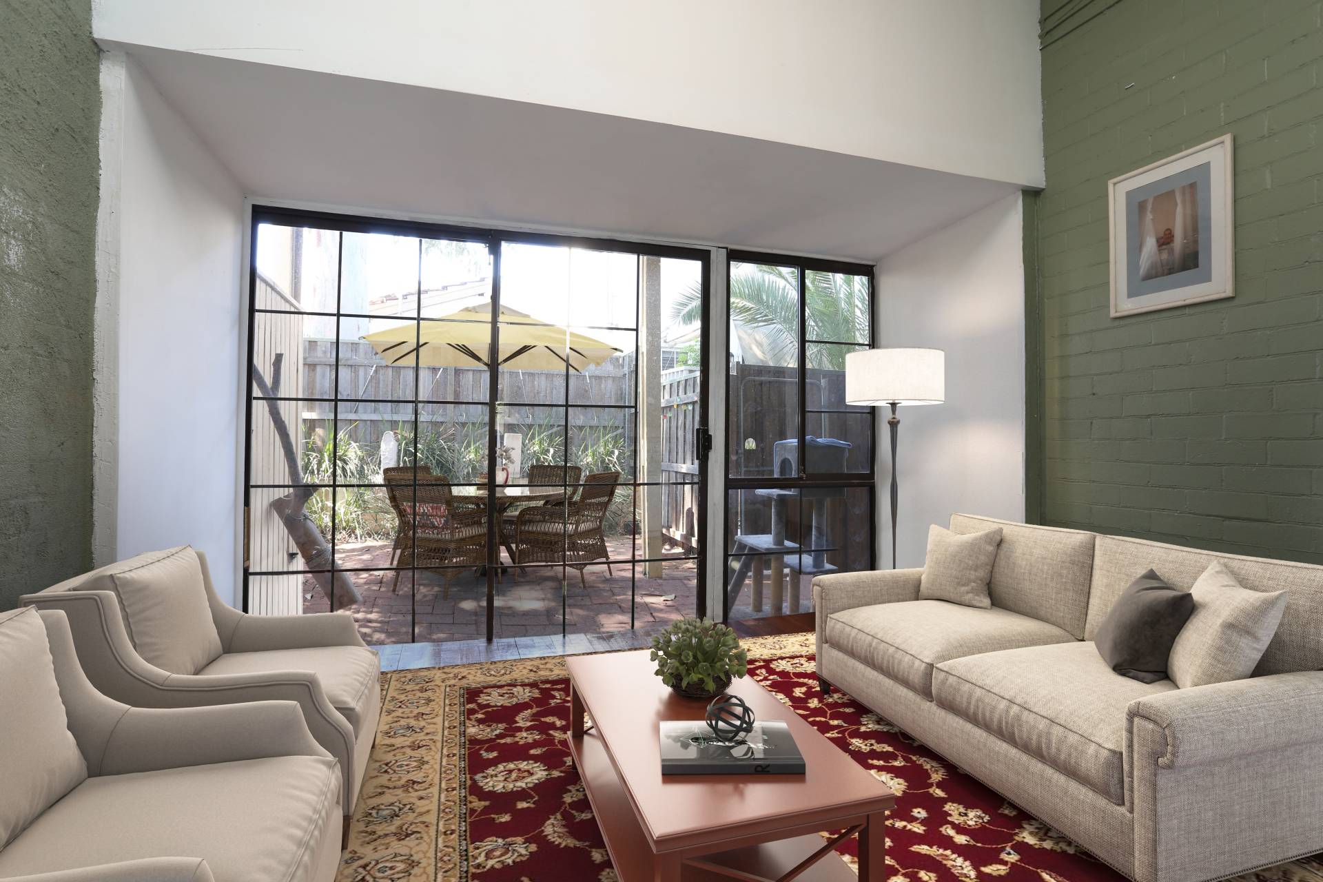 Wrap around courtyard allows for a lifestyle set at home.  Enjoy entertaining your friends and family or simply use room to play in this ground floor apartment.  Bonus sun room allows for separate living areas.  The kitchen is simple, but practical and can easily be made over to suit modern living.